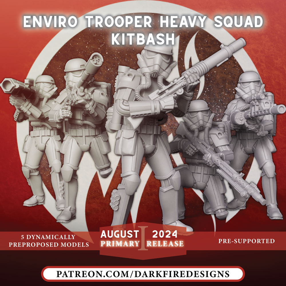 The squad comes with 5 core troopers (available in Mini, Parts & Kits versions), and 5 additional kitbash minis, non-hose helmet variant, and with the 5 weapons available separately for your kitbashing use!