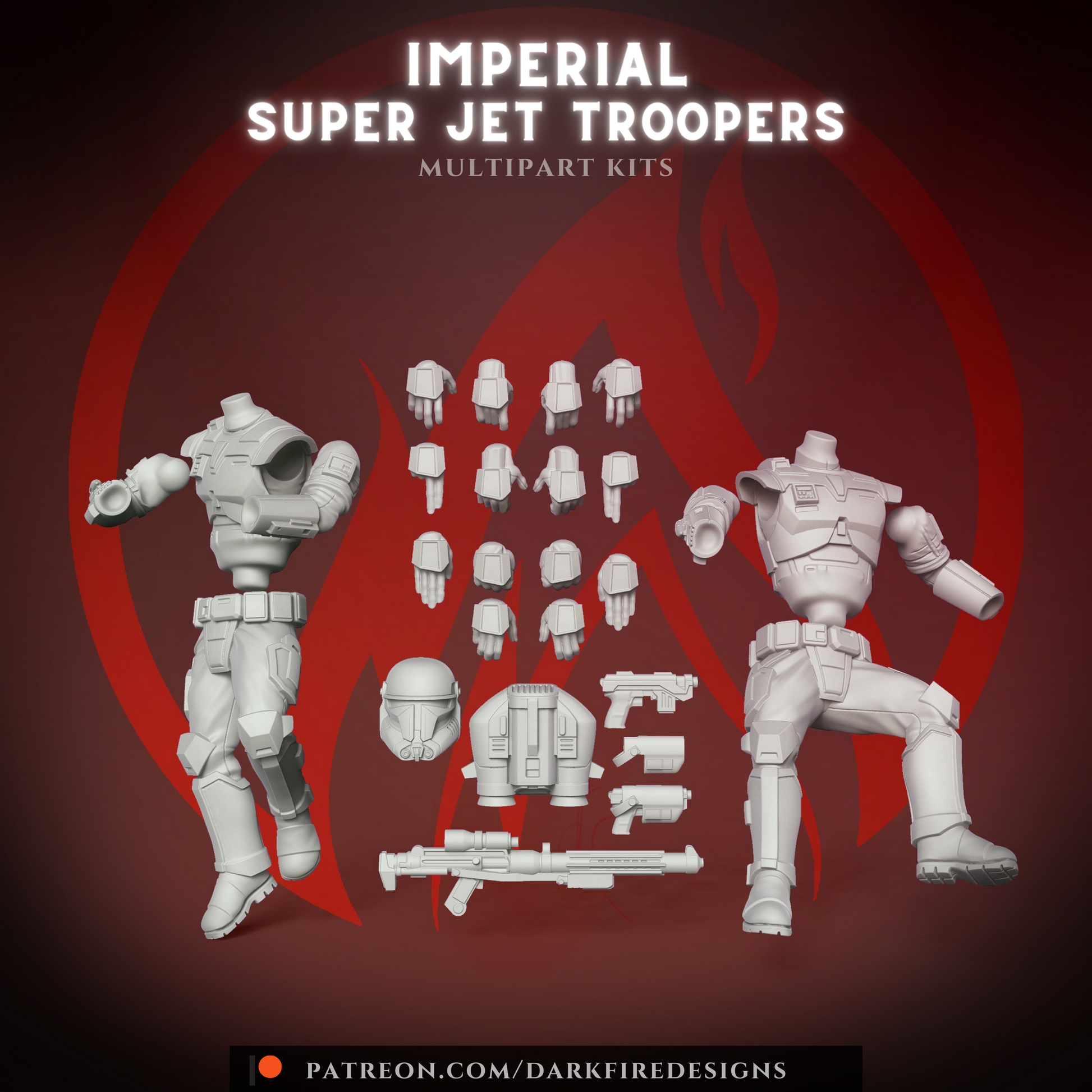 Experience the awe-inspiring might of the Super Jump Troopers, an elite fighting unit forged in the aftermath of the Galactic Civil War by an ambitious Imperial Warlord. Harnessing a rare, resilient alloy exclusive to their mineral-rich mining colony, these outnumbered Imperials have risen to become the vanguard of your Imperial Legion. Outfitted with jet packs, the Super Jump Troopers are captured in breathtaking mid-flight poses, showcasing their incredible agility and the tactical edge they bring to the battlefield.