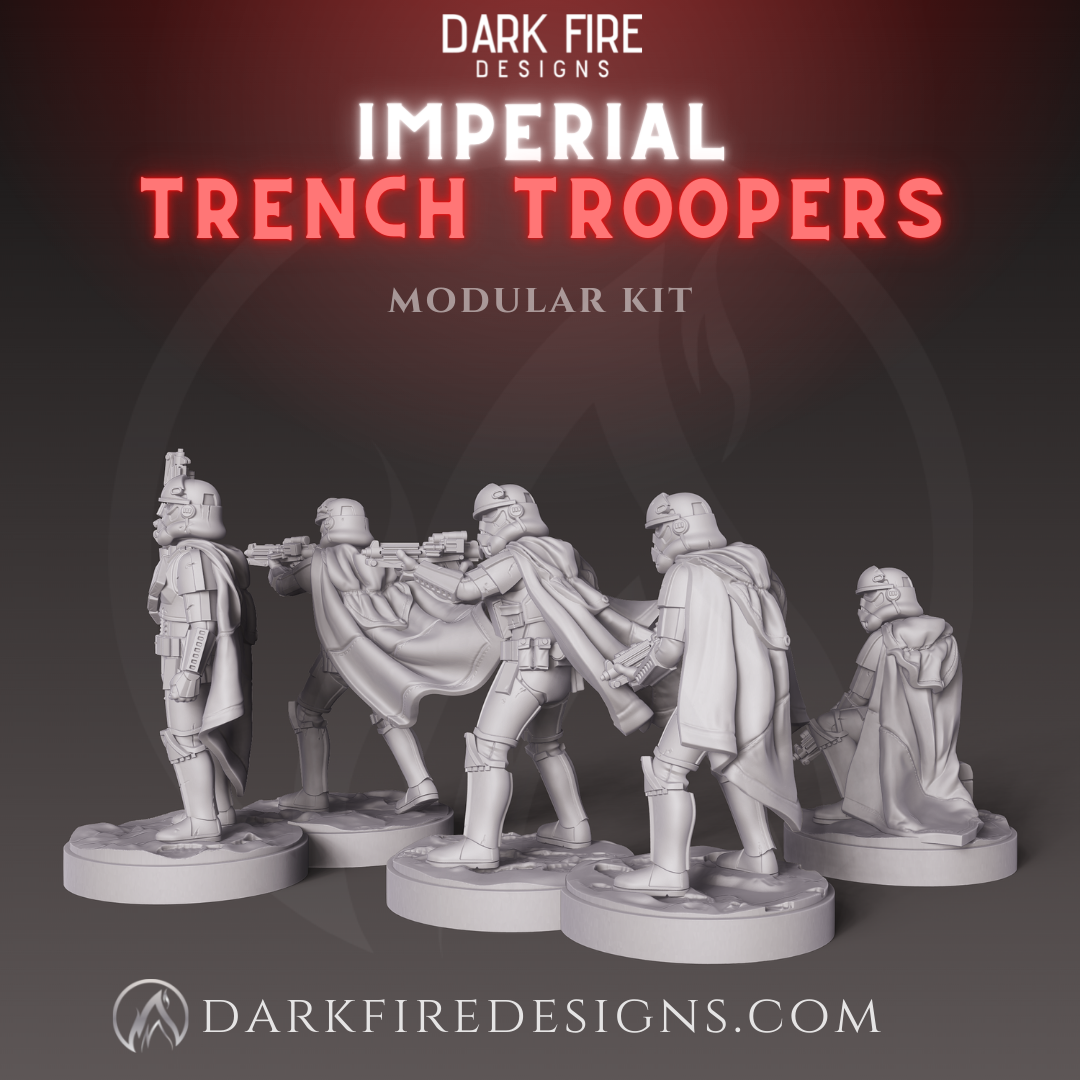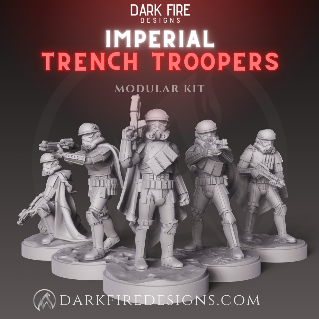 This kit will provide you with everything you need to build Imperial Trench Troops Squad. This kit includes parts to assemble your own modular squad (that can be combined with other Dark Fire Design kits) and preposed minis for quick assembly. This file has been designed for Resin 3d Printers and include supported and standard STL files.