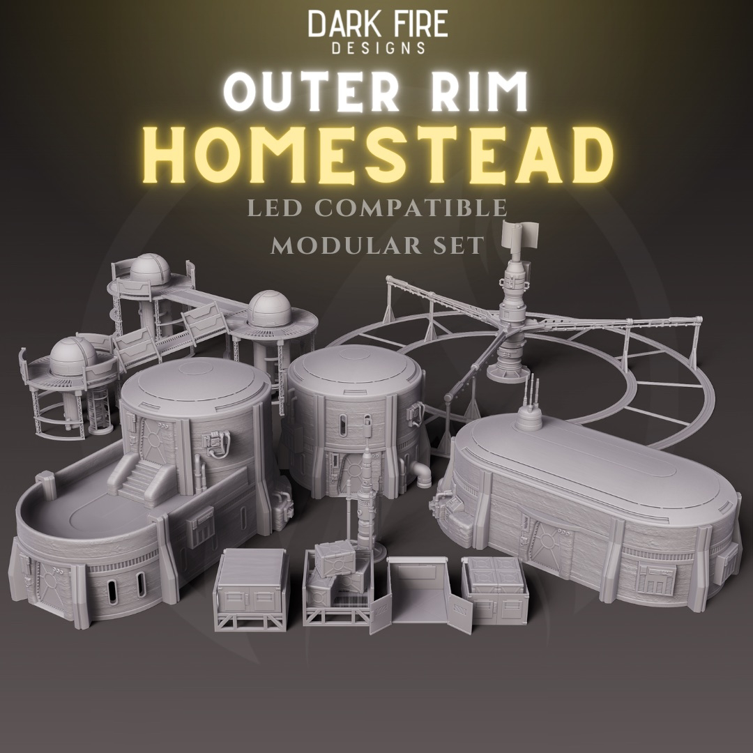 This Homestead Terrain kit is perfect for portraying any outer planet colony or farming community. This kit is packed with modular buildings that allow you to make anything from a simple farming shed to a multistory outer rim cantina, maybe even a living hab.