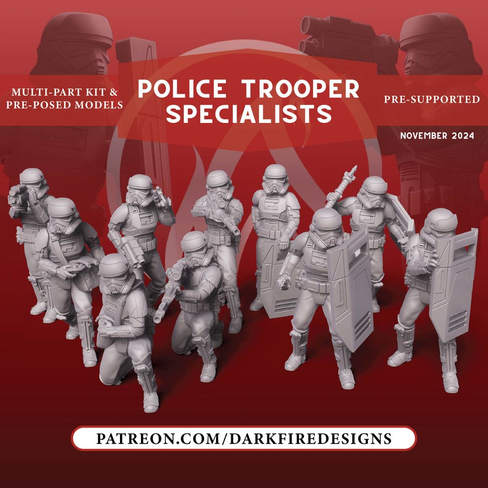 The Police Troopers - Specialists have 5 core troopers (featuring 2 shield troopers, sniper, spotter & demolition trooper, available in Mini, Parts & Kits versions), and 5 additional kitbash minis, and with the weapons available separately for your kitbashing use!