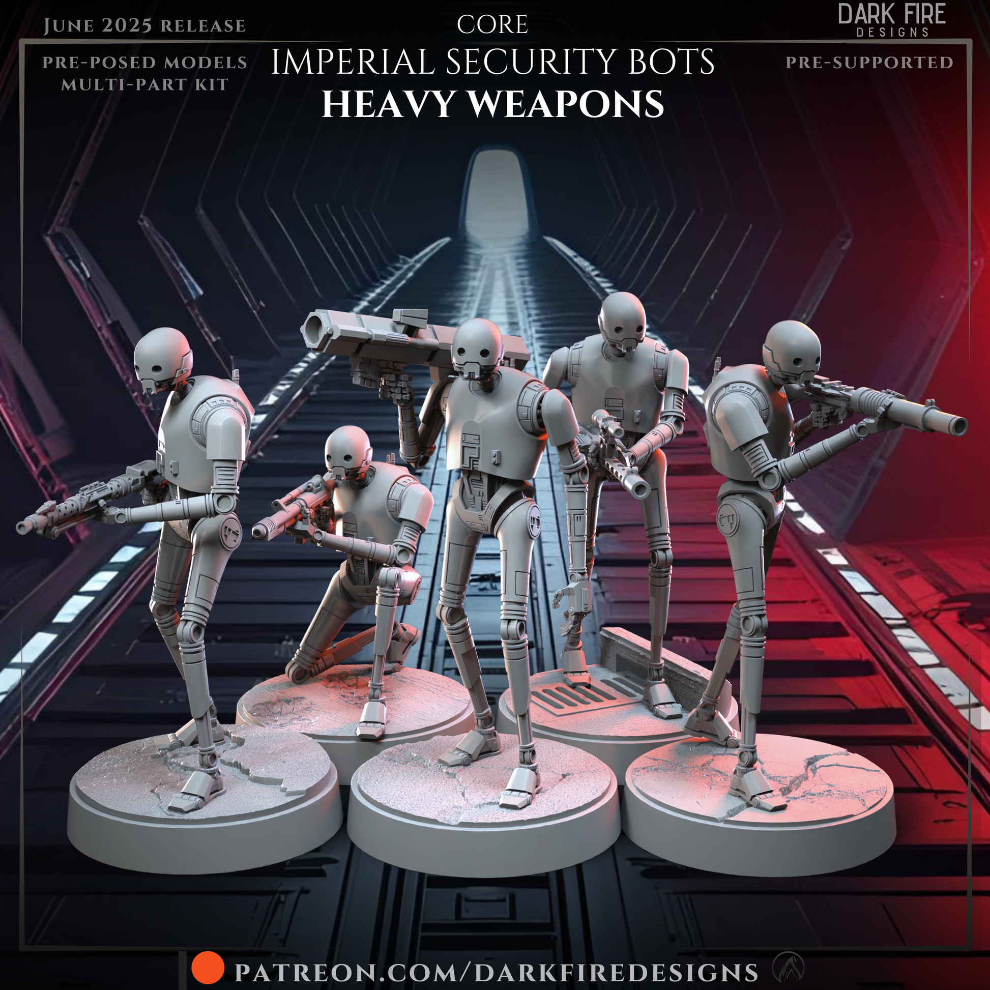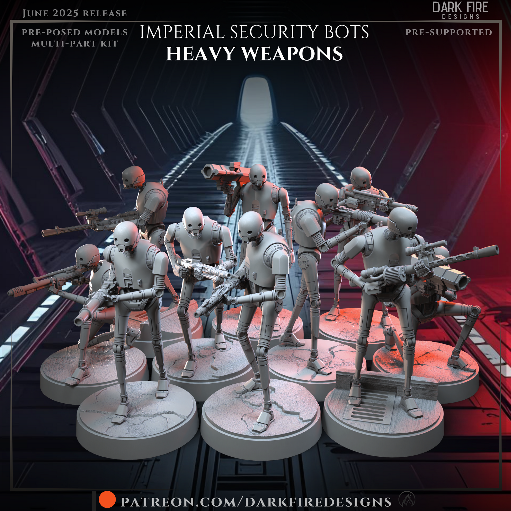 - Imperial Security Bots - Heavy Weapons: 5 base minis with included parts options, plus 5 additional Kitbash miniatures. Multiple weapons included: rocket launcher, heavy rifle, repeater, long rifle & anti vehicle rifle.